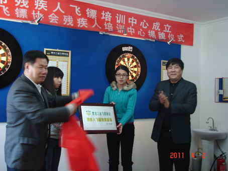 2011年4月2日,由黑龙江省飞镖协会赞助的哈尔滨市残疾人飞镖培训中心正式成立。 上午十时,在新落成的飞镖培训室内举行揭牌仪式。仪式由哈尔滨市残疾人活动中心主任王志刚主持。 参加仪式的嘉宾有: 市残联副理事长孙凤龙 ,省飞镖协会常务副主席 、省欧美同学会副会长郑志成,省飞镖协会副主席刘爽,省飞镖协会秘书长程宏 省飞镖协会教练肖德军。 参加本次活动的还有残疾人运动员和省协会的工作人员。 首先市残联副理事长孙凤龙和省飞镖协会常务副主席 、省欧美同学会副会长郑志成进行了热情洋溢的讲话,并为培训中心揭牌。 省飞镖协会秘书长程宏向市参加人活动中心代表王旋副主任赠送专业飞镖器材。 孙凤龙、郑志成、程宏等领导为飞镖室开镖。 仪式结束后,肖德军教练为到场的残疾人运动员进行了飞镖知识讲解。 黑龙江省飞镖协会残疾人飞镖培训中心的建成,为我市残疾人的体育运动增加了新的项目。也将培养一批能代表我市参加残疾人全运会飞镖比赛的运动员。